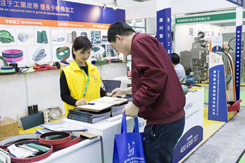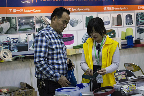 參展商在詳細(xì)了解工業(yè)皮帶樣品